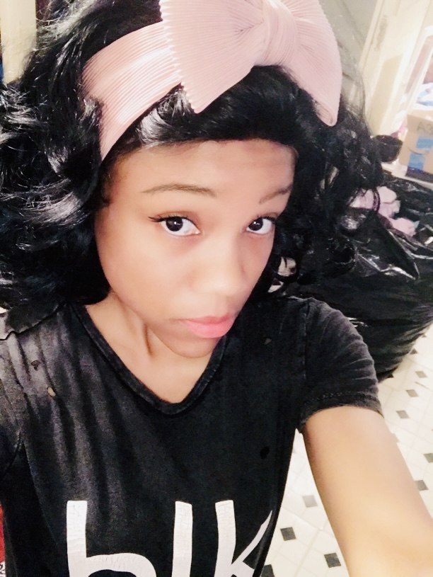 🥰This look is sooo cute sweet and innocent lol because I am lol. This bow is tooo cute something different that I am trying in my hair that I would’ve never done before. I have on a ripped black shirt and jeans.🥰
