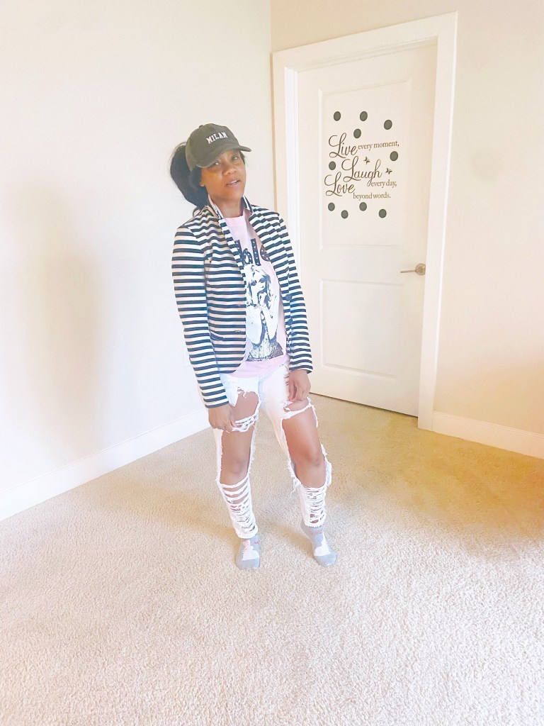🖤Today’s vibe is rock and roll 🎸 lol distressed jeans and T-shirt are my favs. I can’t wear my jeans without them being distressed something about distressed jeans are fun, cute and fashionable to me. Distressed jeans is the only type of jeans in my closet lol🖤